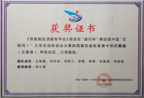 2018年9月9日,第四届中国“互联网+”大学生创新创业大赛陕西赛区省级复赛在西安理工大学落下帷幕。我院学生王继鹏、何依航、李敏、刘特儿、杨男、李甜甜、任杨荣7名同学负责的“饭跑跑生活服务平台”项目荣获省赛(主赛道)铜奖;学生费学文、杨杨、崔宏伟、庞文平4名同学负责的“助农兴农行动项目”(青年红色筑梦之旅)赛道获得铜奖。
