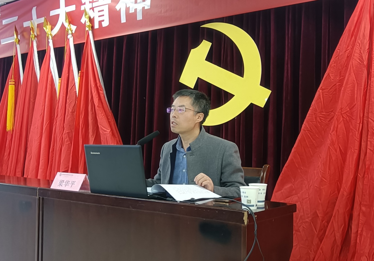 梁华平围绕党的二十大报告,从党的二十大主题和主要成果、过去5年的工作和新时代10年的伟大变革、马克思主义中国化时代化、中国式现代化、全面建设社会主义现代化国家的目标任务、坚持党的全面领导和全面从严治党、关于应对风险挑战等七个方面做了深入解读与阐释。