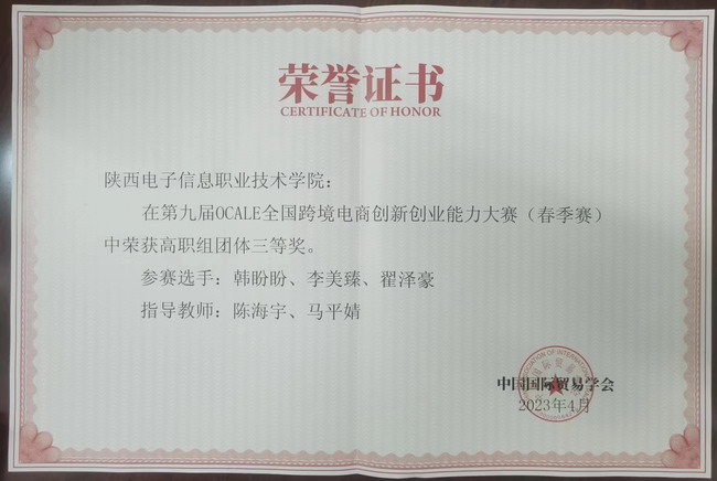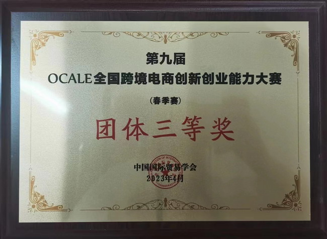 4月25-27日,我院参加了由商务部中国国际贸易学会主办的第九届OCALE全国跨境电商创新创业能力大赛(春季赛)。在陈海宇、马平婧老师指导下,学生韩盼盼、李美臻和翟泽豪经过奋力拼搏,荣获团体三等奖。