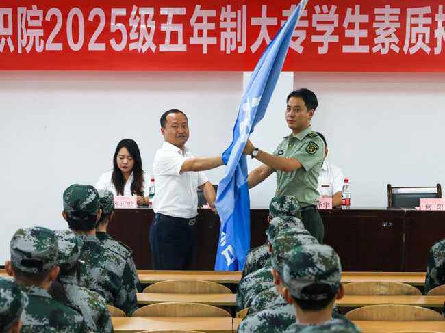 最后,文理学院院长张鹏为训练营授旗,并宣布2025级五年一贯制大专学生素质拓展训练正式开营。
