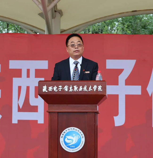 9月4日下午,陕西电子信息职业技术学院校园内彩旗飘扬、气氛庄重,2025 级新生军训动员大会在运动场召开。理事长、院长王明星出席会议并讲话,党委书记石光华为军训团授旗。军训团长杨丽森,党委副书记、副院长年小望,党委副书记、纪委书记马放奇等院领导参会,会议由军训团政委、副院长李泽宇主持。