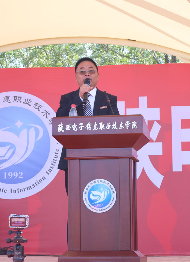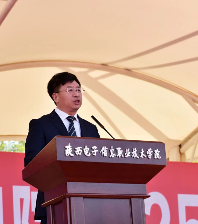 三是坚持阅读与运动,让健康习惯成为“终身财富”。”他要求同学们“少刷一段短视频,多读一本能滋养心灵的书;少赖一次温暖的床,多跑一圈洒满阳光的操场。阅读与运动是成本最低、收益最高的自我投资,希望它能成为你们一生的习惯。” 最后,王明星与新生们定下 “三年之约”:“学院为大家量身打造了专升本、应征入伍、出国留学、技能成才四大平台,希望未来三年,你们能在这里找到方向、深耕专业。等到毕业典礼那天,我期待看到每一位同学都成长为‘讲政治、有思想、有文化、有技能、能自立’的陕电职院人,带着陕电职院的印记,自信地走向更广阔的天地!” 话语间满是期许,台下掌声经久不息,新生们眼中闪烁着对未来的憧憬。