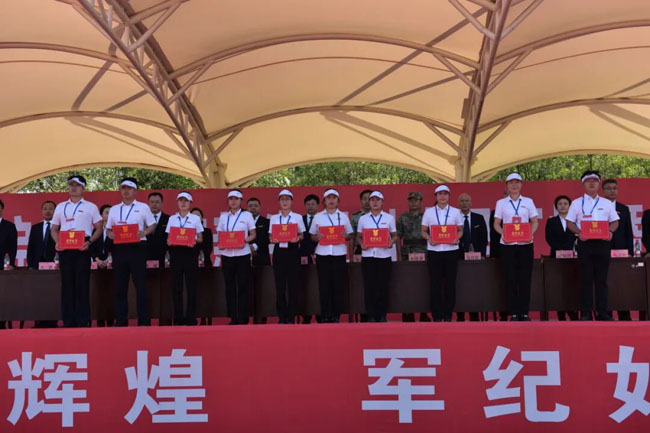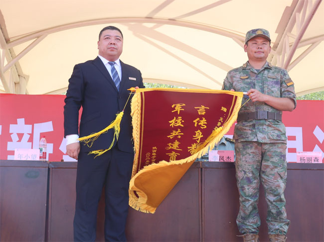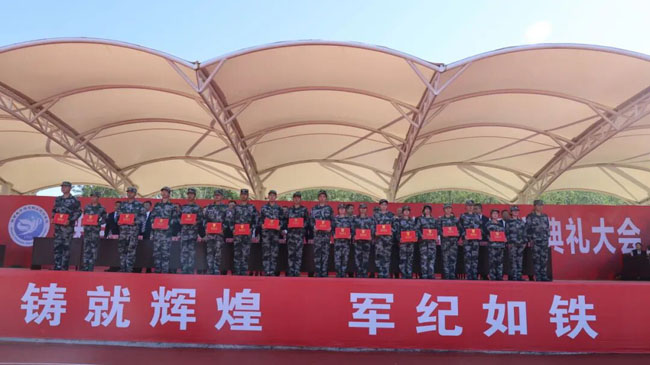 汇报表演结束后,表彰环节温情启幕。与会领导依次为优秀标兵代表、优秀连队、优秀辅导员、优秀教官、优秀宿舍代表颁发奖牌与证书。沉甸甸的荣誉握在手中,是对为期15天军训汗水的最好回馈,获奖代表们敬礼致谢时,眼中满是自豪与激动。随后,党委副书记、副院长年小望代表学院,向辛勤承训的单位赠送锦旗,红色锦旗上的鎏金字迹,承载着学院对教官们日夜付出的诚挚敬意。
