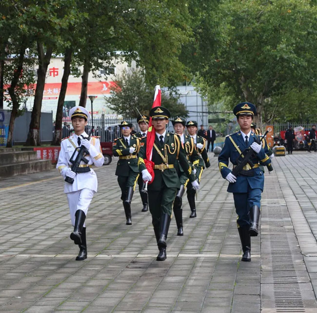 伴随着雄壮激昂的《义勇军进行曲》,护旗手迈着整齐有力的步伐护送国旗至旗杆下,五星红旗在全体师生的注目礼中缓缓升空、迎风飘扬。