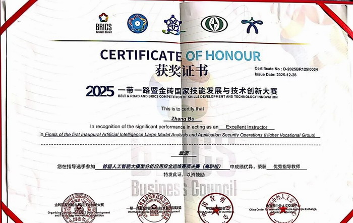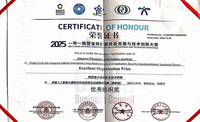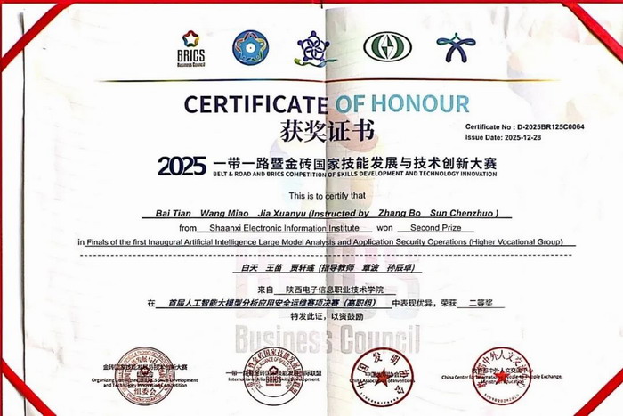 近日,2025一带一路暨金砖国家技能发展与技术创新大赛——首届人工智能大模型分析应用安全运维赛项国际总决赛圆满落幕。陕电职院参赛师生表现亮眼,一举斩获高职组国家级二等奖、优秀指导教师、优秀组织奖等多项荣誉。