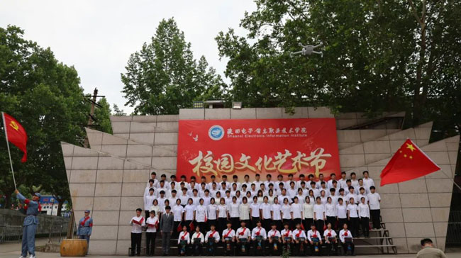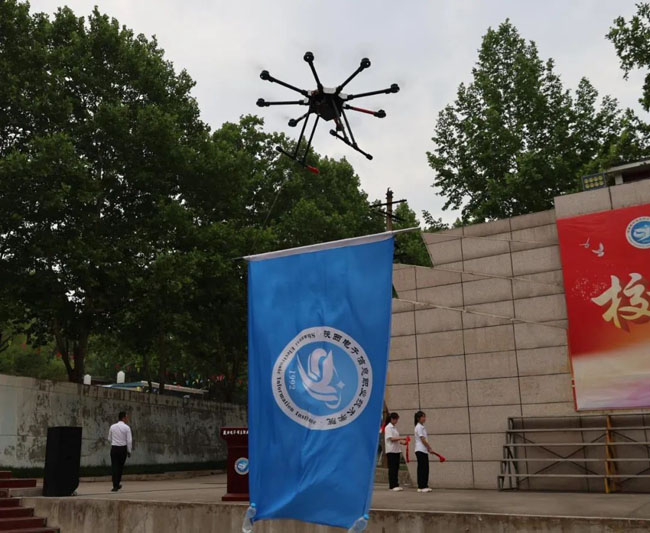夜幕降临,华灯初上。比赛在绚丽夺目的开场舞《灯火里的中国》中拉开帷幕,现场气氛瞬间被点燃。随着一架无人机缓缓升空,悬挂着陕电职院的校旗,在夜空中显得格外耀眼,象征着学校的蓬勃发展与无限希望,引得台下掌声雷动,欢呼连连。