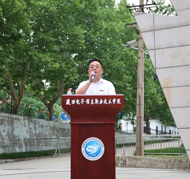 党委委员、副院长李泽宇在讲话中回顾了本届校园文化艺术节一系列精彩纷呈的活动。他指出,这些活动不仅丰富了同学们的课余生活,更为大家搭建了一个展示自我、提升素养、传承文化的广阔平台,让校园文化焕发出勃勃生机。他强调,赓续红色血脉,传承红色基因,是同学们义不容辞的责任与使命。希望同学们在今天的比赛中,用嘹亮的歌声唱出对党、对祖国、对人民的无限热爱,唱出新时代青年的壮志豪情与责任担当;用深情的演绎展现出陕电职院学子朝气蓬勃、昂扬向上的精神风貌,让红色旋律在校园上空久久回荡。