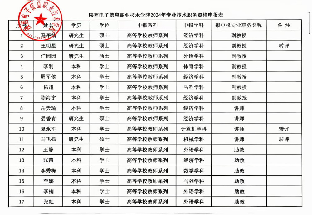 陕西电子信息职业技术学院关于2024年教师系列职称评审结果的公示