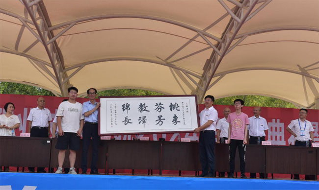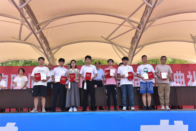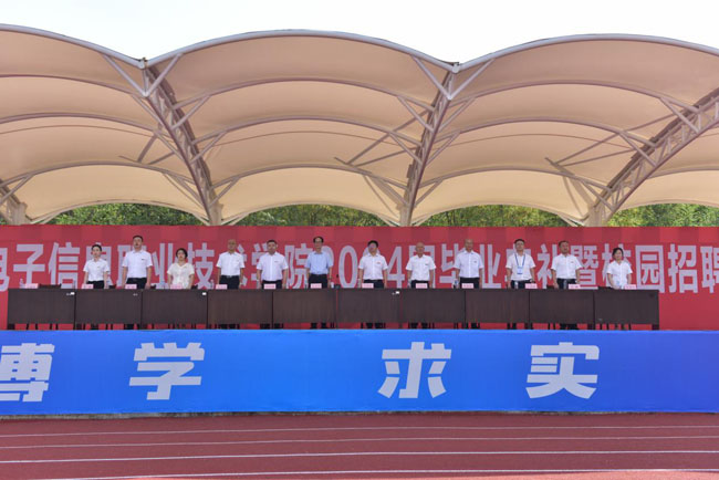 当日,天朗气清,万木竞秀,杨柳依依。整饬一新的学院田径运动场彩旗招展,师生们迈着整齐的步伐依次进入典礼现场。