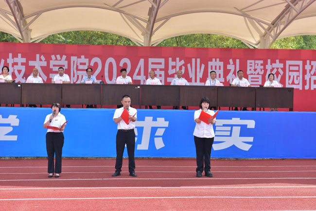 6月28日上午,我院在田径运动场隆重举行2024届毕业典礼。院党委书记石光华,理事长、院长王明星等院党政领导班子成员,全体教职工,2024届毕业生,在校师生及企事业单位代表3000余人参加典礼活动,共同见证这一重要时刻。典礼由院党委委员、副院长石晓英主持。