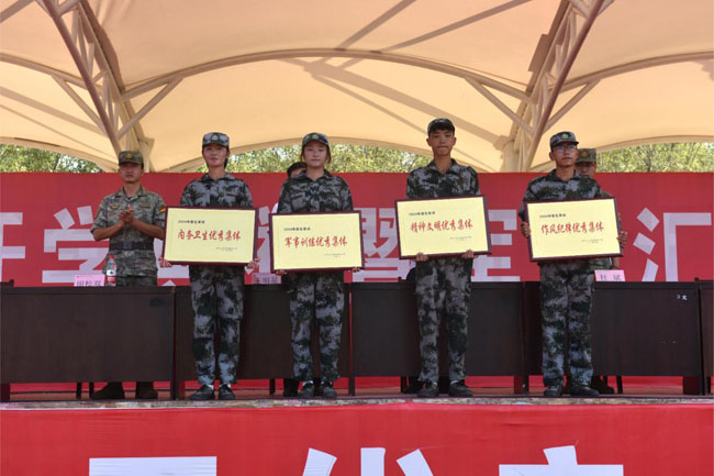 在军训期间,同学们不怕吃苦、顽强拼搏,涌现出了一批先进集体和个人。军训团参谋长杜斌代表学院宣读了表彰军训先进集体和个人的决定。决定授予十一连军事训练优秀集体,六连内务卫生优秀集体,二连作风纪律优秀集体,十三连精神文明优秀集体荣誉称号;授予吕小龙等7名同志“优秀教官”荣誉称号;授予张欣怡等13名同志“优秀辅导员”荣誉称号;授予吕梦洲等26名同学“军事训练优秀个人”,授予陈逸飞等26名同学“作风纪律先进个人”,授予赵娜等26名同学“内务卫生先进个人”,授予张翔雨等26名同学“后勤保障优秀个人” 荣誉称号;授予李智隆、何孟洁等240名同学“优秀学员”荣誉称号。学校领导为这些优秀集体和个人颁发了荣誉证书,以表彰他们在军训中的出色表现。
