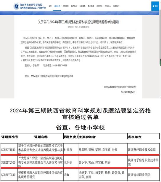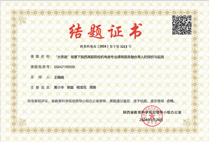 近日,经省教育科学规划领导小组办公室专家鉴定,我院基础部王娟娟老师主持,黄小华、郭晶、程宝花、周香老师参与申报的省级课题《“大思政”背景下陕西高职院校机电类专业课程思政融合育人的探究与实践》通过专家评审验收,圆满结题。