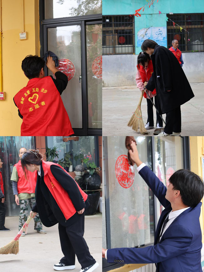 学生们积极行动,为老人们的生活空间进行细致打扫。