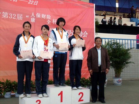 我院0805班炎雯同学在今天的女子组跳高比赛中获得铜牌(左二)
