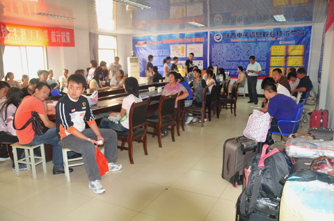 学校在西安火车站、城西客运站、城北客运站、城南客运站都设有新生接待点,并有专车直接把新生和家长送到学校,免去了新生人生地不熟的奔波之苦。抵达校园后,由高年级的学长学姐们组成的志愿者队伍,有的帮新生家长提行李,有的带领新生去办理报到手续,有的忙着向新生介绍学院的基本情况。一号教学楼的大厅内设置了各系的咨询点,接待人员耐心细致的为新生及家长讲解注册流程,并为新生和家长答疑解惑。一楼的大会议室被设为家长休息室,在休息室内学校还为家长和新生们准备了餐卡、凉茶等解暑用品。
