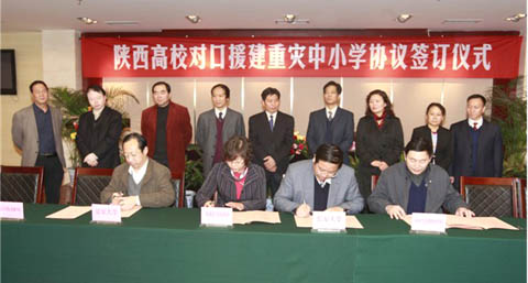 我院非常重视支援灾区校园重建工作,接到陕西省教育厅《关于开展高等学校对口援建中心小学灾后重建工作的通知》﹙陕教财〔2010〕105号﹚和陕教财办〔2010〕13号文件后,学院领导研究决定向商南县魏家台乡中心小学捐赠援建资金伍万元,帮助他们尽快重建。11月19日下午,陕西高校对口援建重灾中心小学签订仪式在省教育厅的组织下在西安隆重举行,院长邢永华和院长助理田志岗出席了签约仪式,院长邢永华代表学院签字。