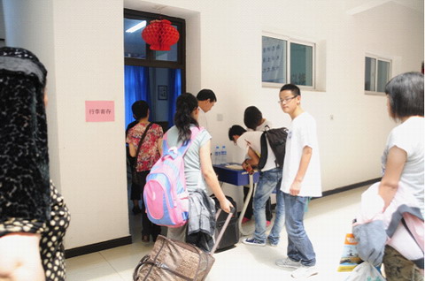 学校在西安火车站新生接待点,并有专车直接把新生和家长送到学校,免去了新生人生地不熟的奔波之苦。抵达校园后,由高年级的学长学姐们组成的志愿者队伍,有的帮新生家长提行李,有的带领新生去办理报到手续,有的忙着向新生介绍学院的基本情况。教学楼的大厅内设置了各系的咨询点,接待人员耐心细致的为新生及家长讲解注册流程,并为新生和家长答疑解惑。学院会议室被设为家长休息室,在休息室内学校还为家长和新生们准备了餐卡、凉茶等解暑用品。
