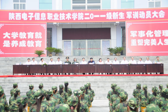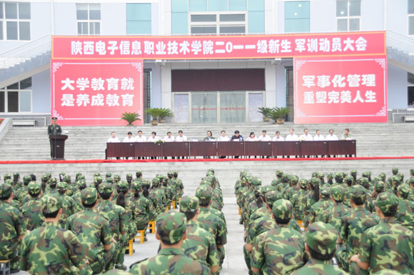 军训动员大会在嘹亮的中国人民解放军军歌声中拉开了帷幕。军训师参谋长严孟军同志宣布了陕西电子信息职业技术学院2011级新生军事训练实施计划。董事长王明亮同志向军训团授予了团旗。新生代表赵金亮和教官代表周志强先后在大会上发言。