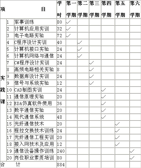 实践教学体系主要包括由入学及毕业教育、军事训练(80学时)、各课程实验、上机练习、专业技能训练(课内实验、独立或综合实训)、社会调查、社会公益活动、毕业论文、毕业实习、岗位职业素质培训等内容组成的实践性教学体系。
