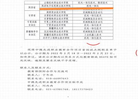 按照《教育部办公厅关于开展中德先进职业教育合作项目遴选工作的通知》(教外厅函2021]16号)工作要求,中德先进职业教育合作项目(SGAVE)秘书处按照评审标准和流程,组织专家开展对申报院校的遴选工作。经过对申报材料的书面评审和院校实地考察,从464所申报院校中遴选出首批试点院校289所,试点专业310个,我院机电一体化专业入选其中。项目借鉴德国等欧洲国家行业龙头企业开展“双元制”人才培养的技术和经验储备,根据《中华人民共和国经济和社会发展第十四个五年规划和2035年远景目标纲要》中所涉及的汽车、智能制造、新一代信息技术等重点领域相关专业,按照“双元制”模式要求中德联合开发和实施适应我国国情的技术技能人才培养方案。通过课程体系建设、“双师型”教师队伍培养、考核和评估认证体系构建等多种方式,推动“三教”改革,为我国制造业转型升级和高质量发展奠定人才基础。